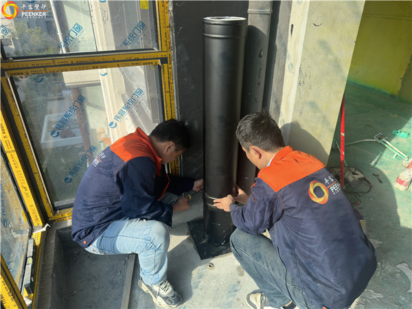 项目介绍:该项目为叠墅上叠,壁炉被安装在一楼位置,烟囱穿阳台顶到二楼出侧墙加高到户外,该项目由平客壁炉项目部带队上门安装。